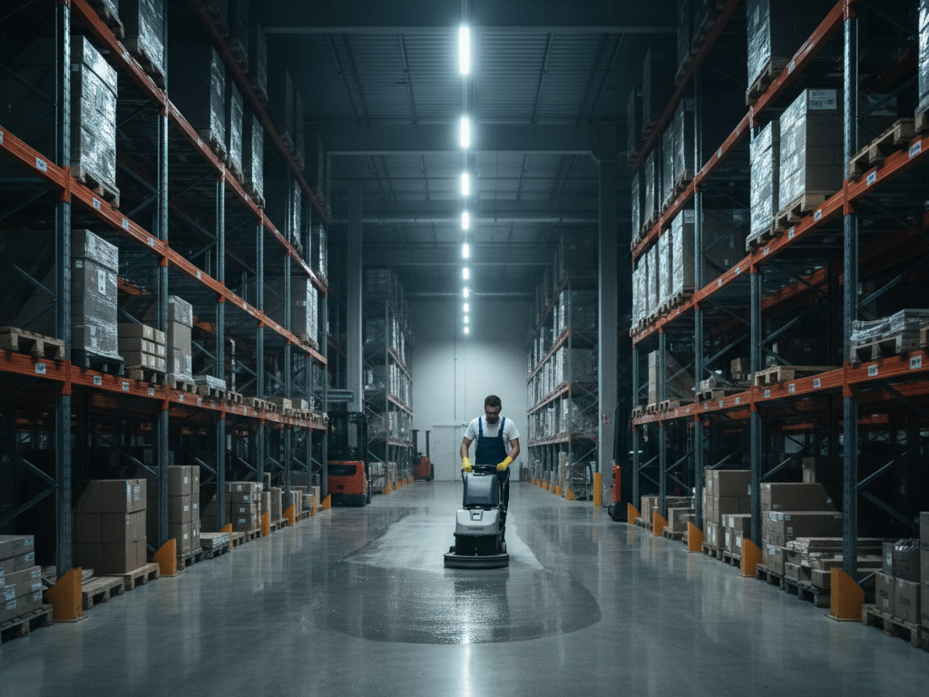Dust, debris, and forklift traffic demand robust methods. We service production floors, racking zones, break areas, offices, and welfare spaces inside industrial sites.